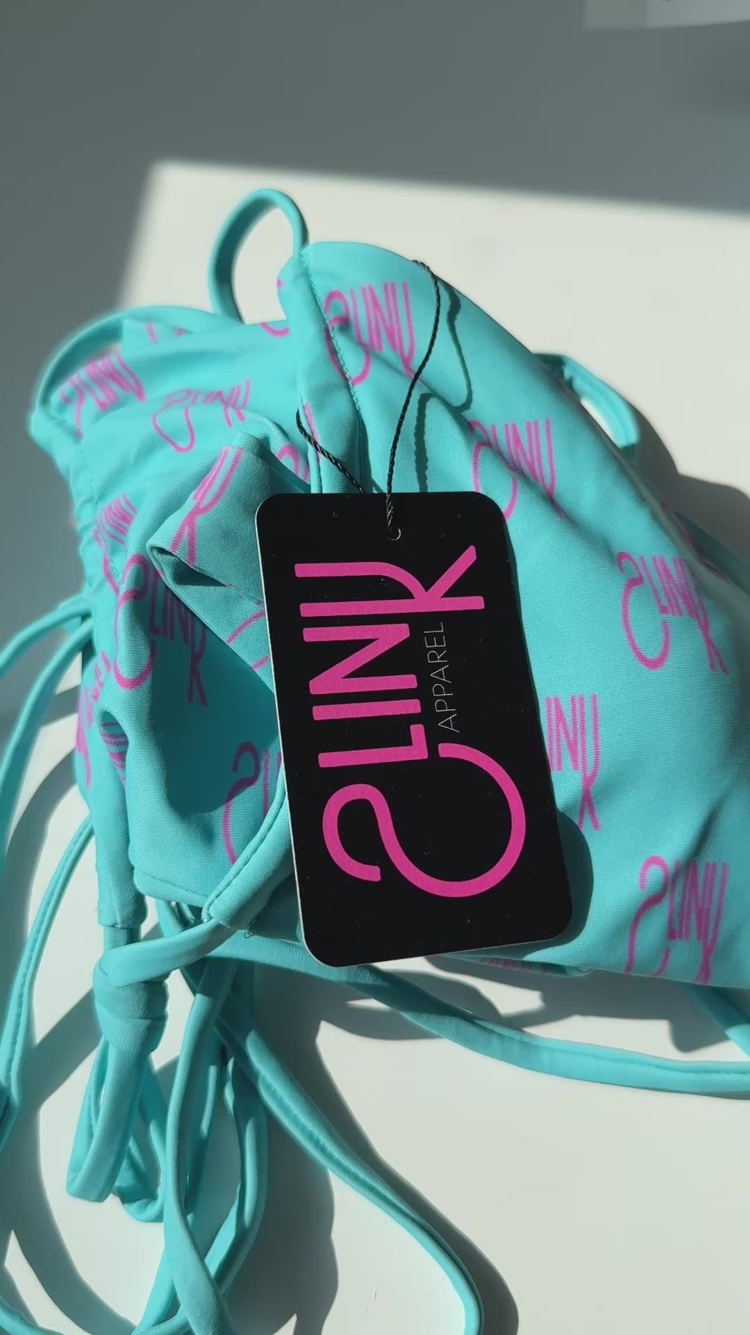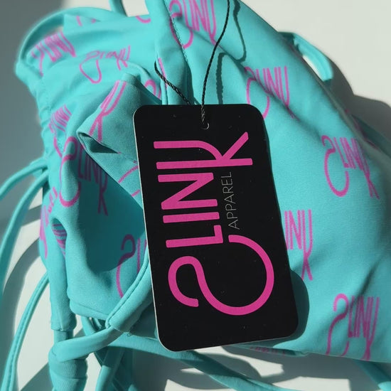 Slip into aqua with hot pink Slink logos and let the straps do the talking. The wrap design is made for movement, with extra-long ties and loops in the bottoms so you can style it your way. From a sultry criss-cross to a daring wraparound, this set is all about giving you the main character energy.