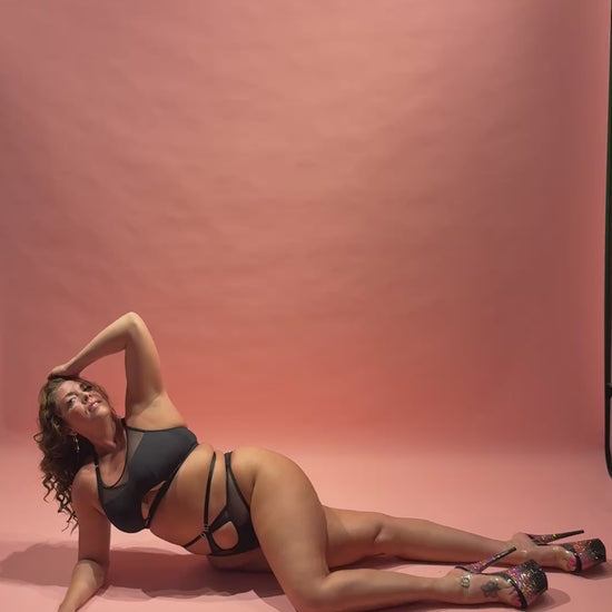 Eat every count our belted bottoms in black. This piece features black mesh details and soft fabric that will have you feeling like a Doll! The adjustable straps at the waist add a little something spicy to the look.